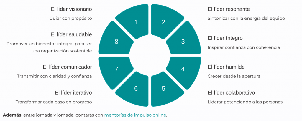 Ocho jornadas presenciales, a lo largo de ocho meses, centradas en el desarrollo del liderazgo humanista. Una metodología práctica y vivencial que combina conocimiento, experiencia y acción para transformar la manera de liderar equipos y organizaciones.